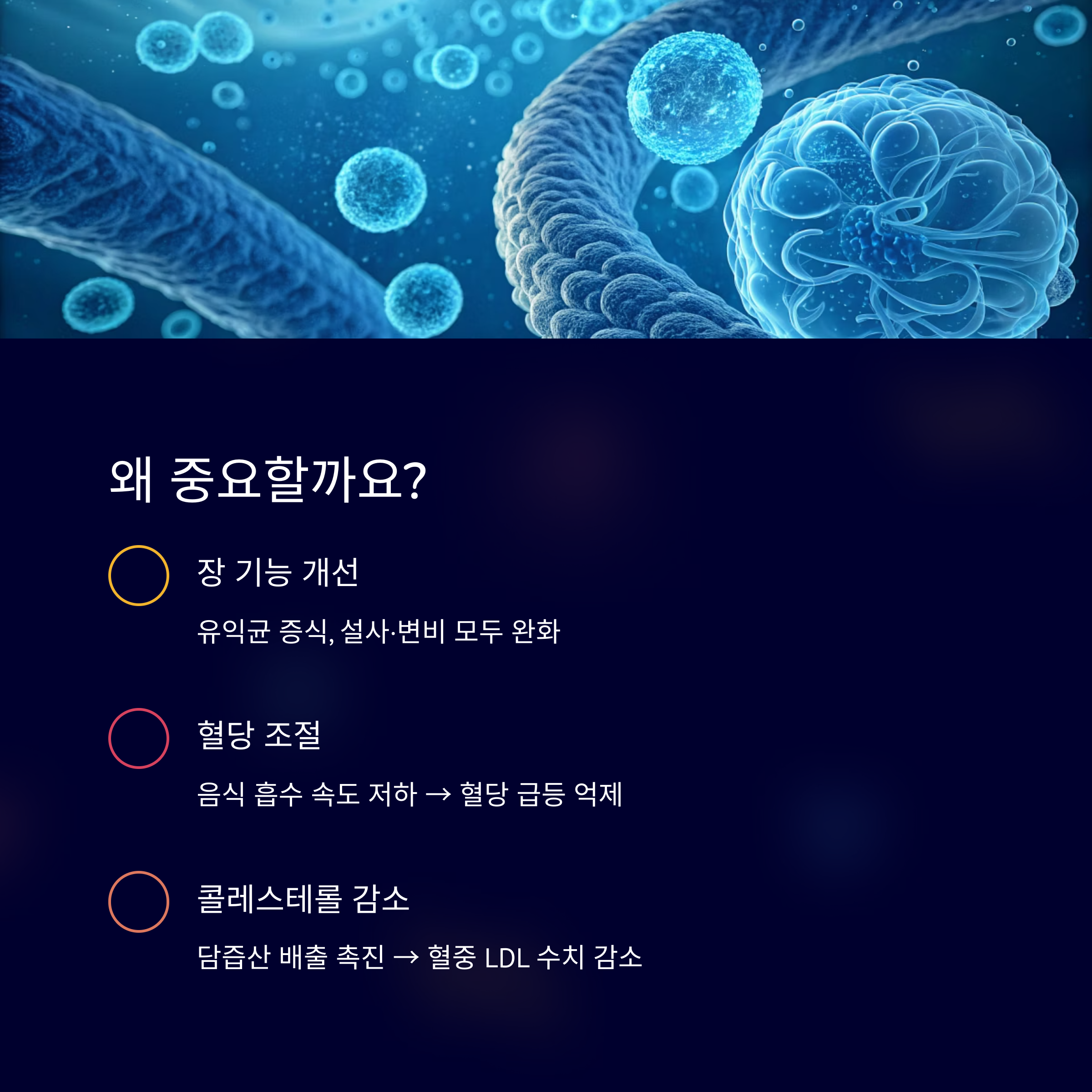 몸속 순환과 장 건강을 동시에 챙기고 싶다면 오늘부터 식단에 수용성 식이섬유를 더해보세요.