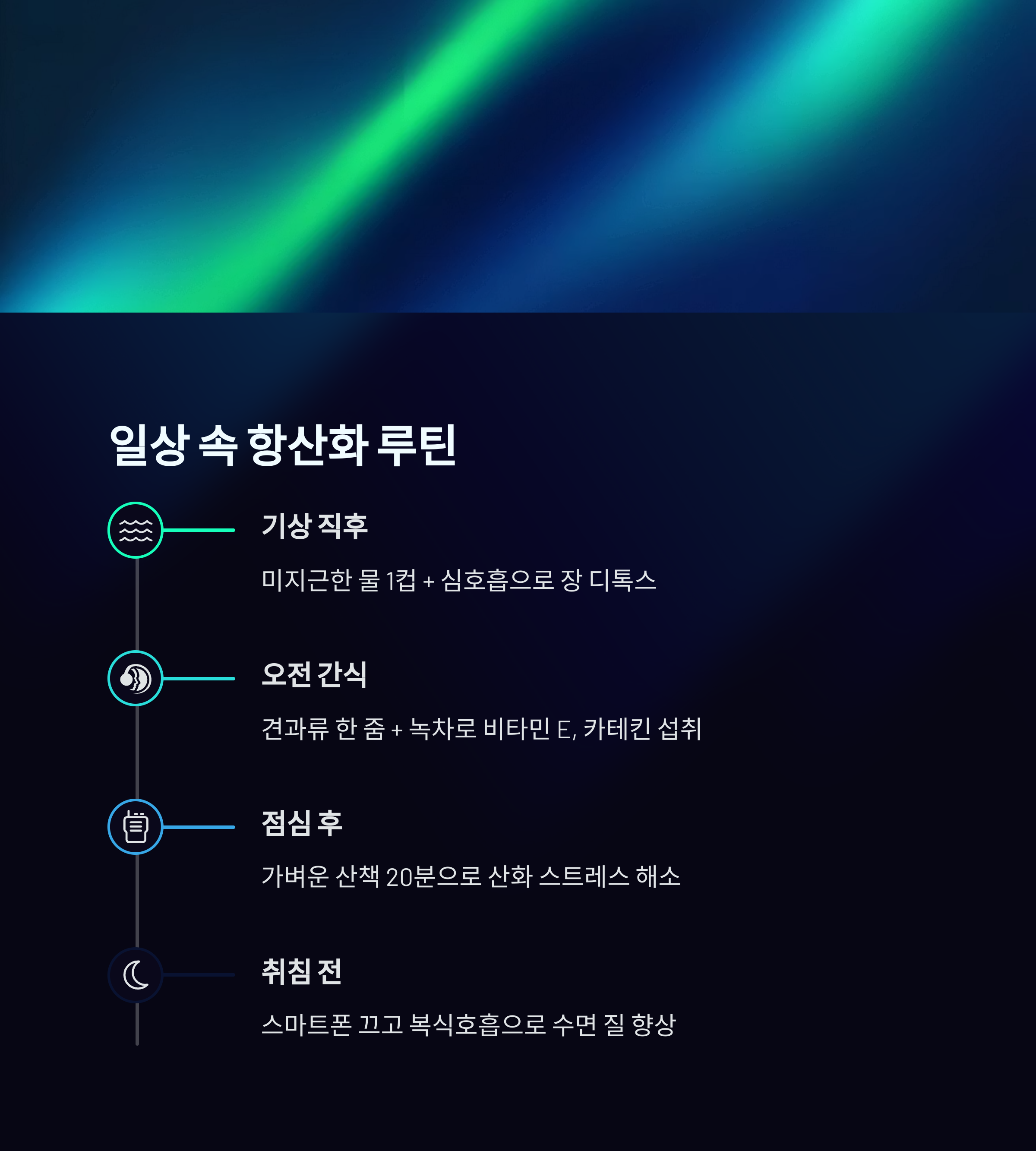 다음 루틴은 실생활에서 실천 가능한 하루 항산화 습관입니다.