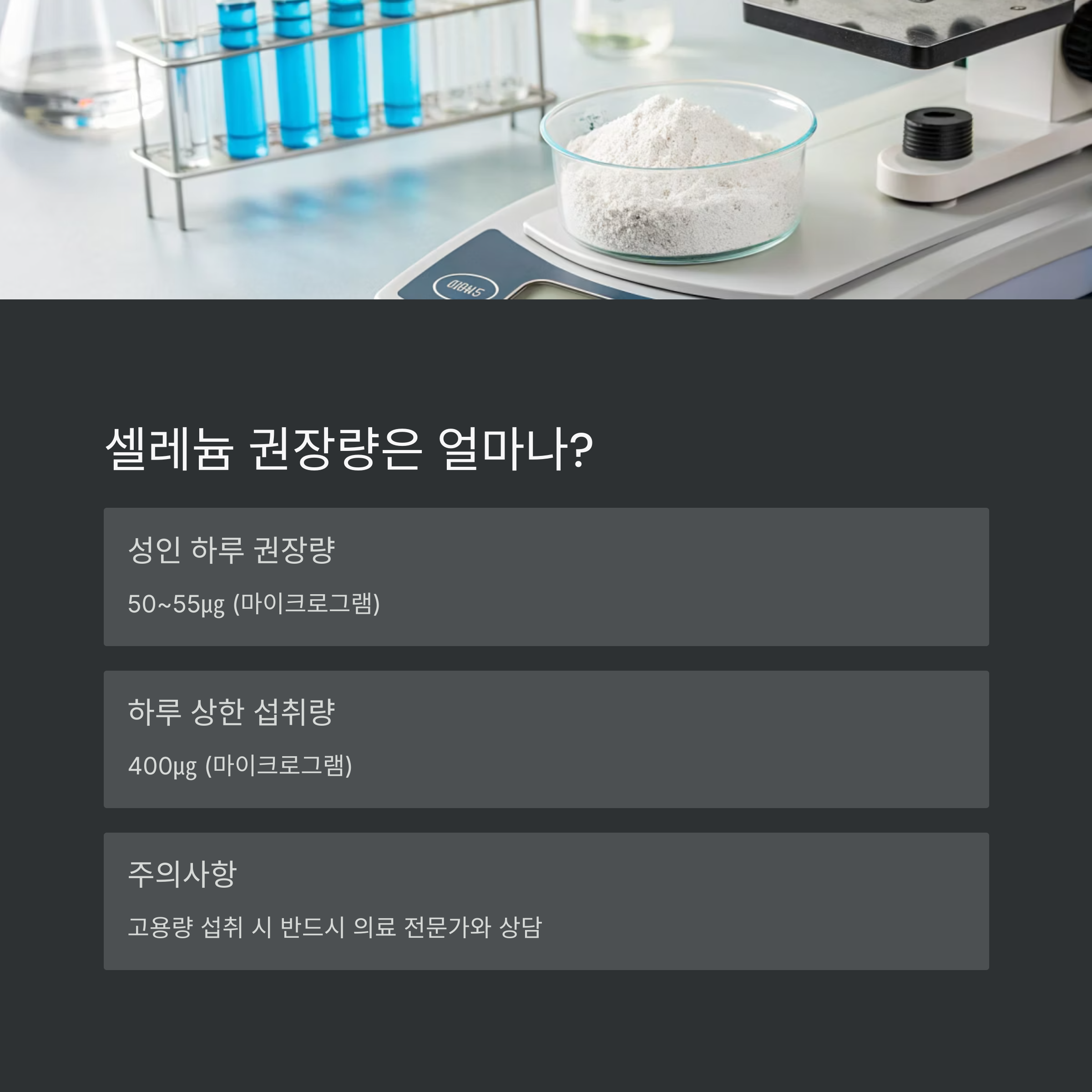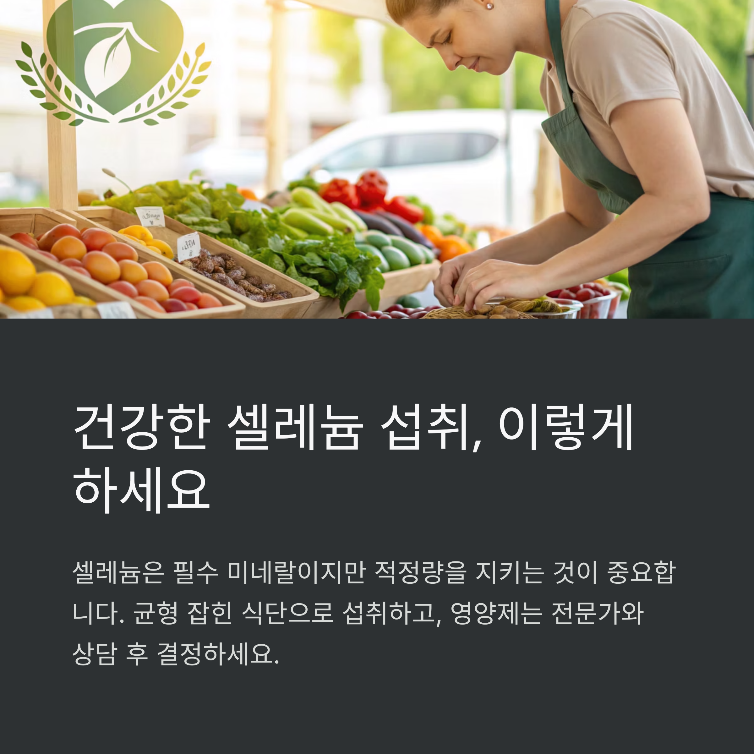 ※ 중요: 질병의 예방 및 치료 목적으로 고용량 셀레늄을 섭취할 경우 반드시 의료 전문가와 상담 후 결정해야 합니다.