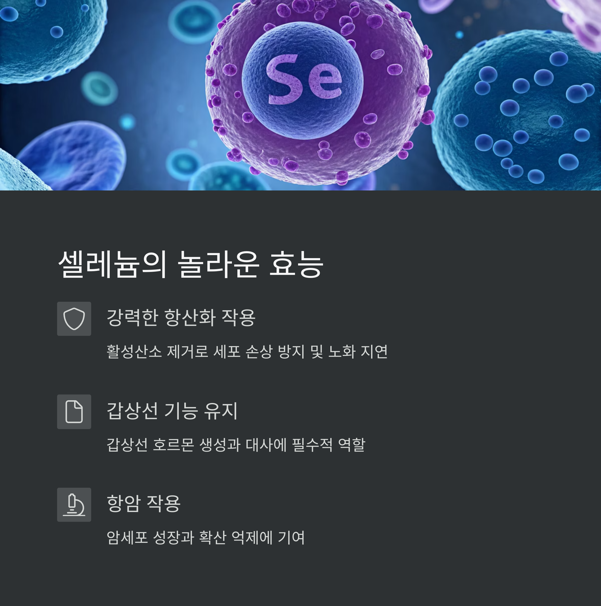 셀레늄은 우리 몸의 여러 중요한 생리 기능에 관여하는 핵심적인 미량 미네랄입니다.