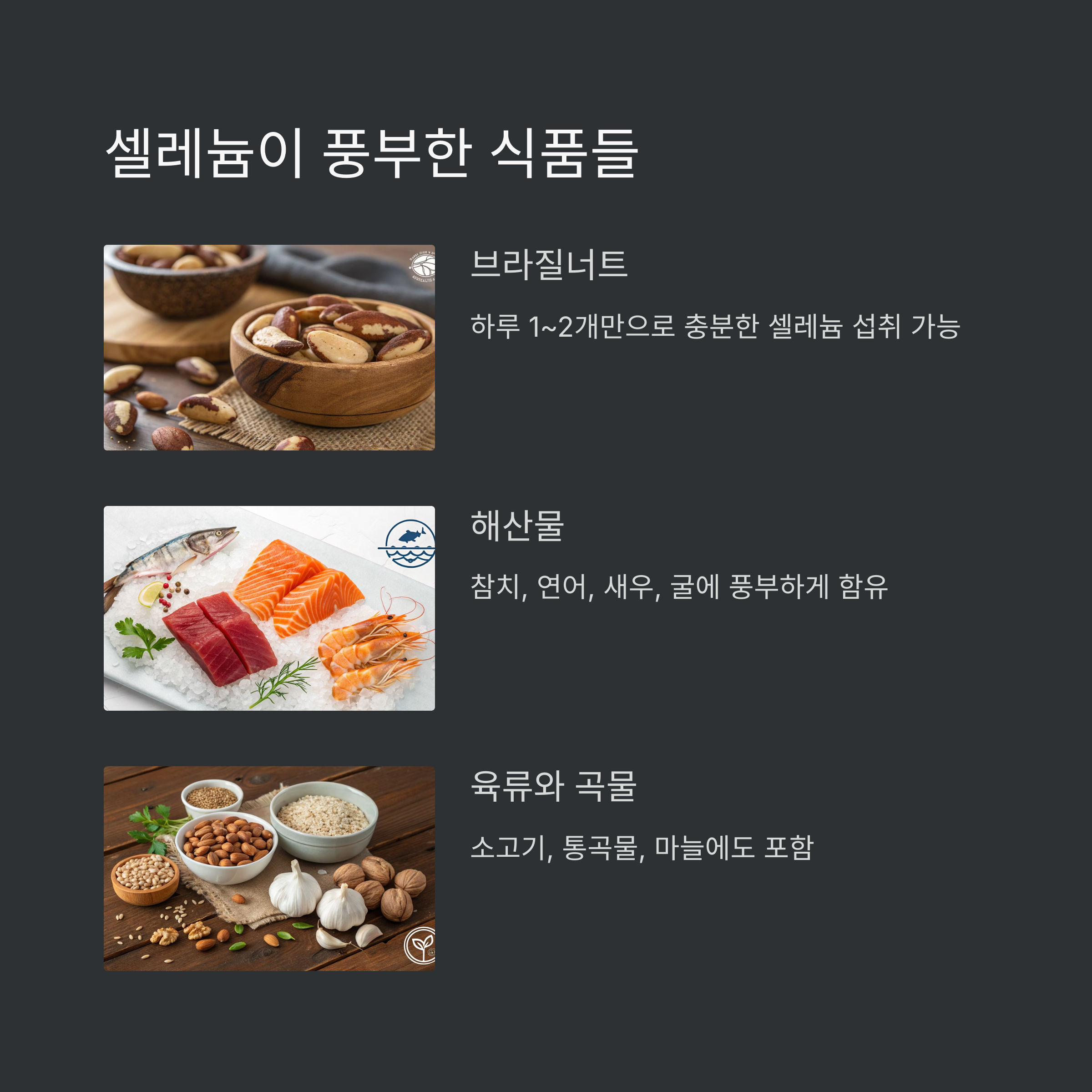 셀레늄은 다양한 식품에 자연적으로 존재하며, 영양제보다는 음식으로 섭취하는 것이 가장 이상적입니다.
