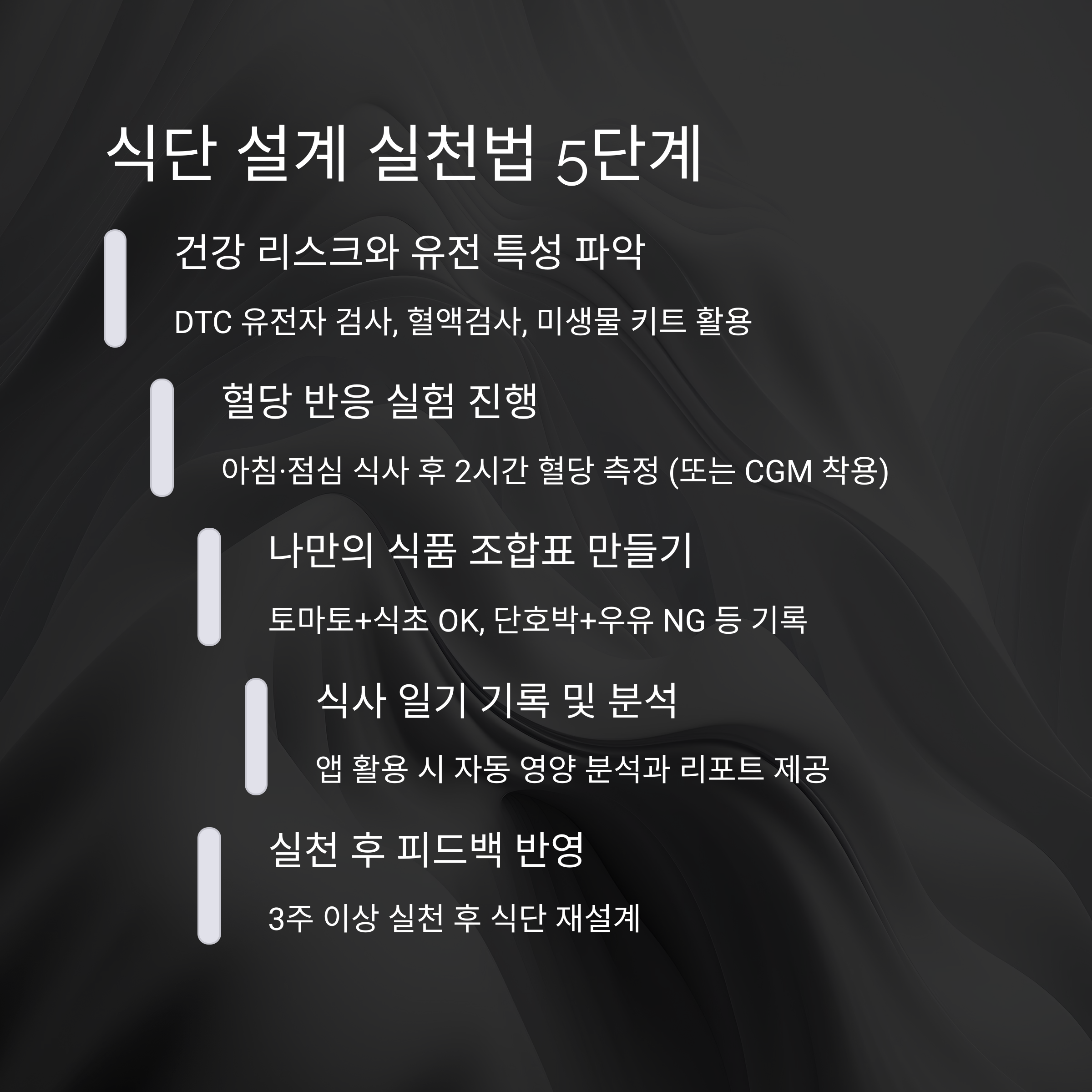 → 아침·점심 식사 후 2시간 혈당 측정 (또는 CGM 착용) - 나만의 '위험 음식 리스트'와 '안전 조합표' 만들기