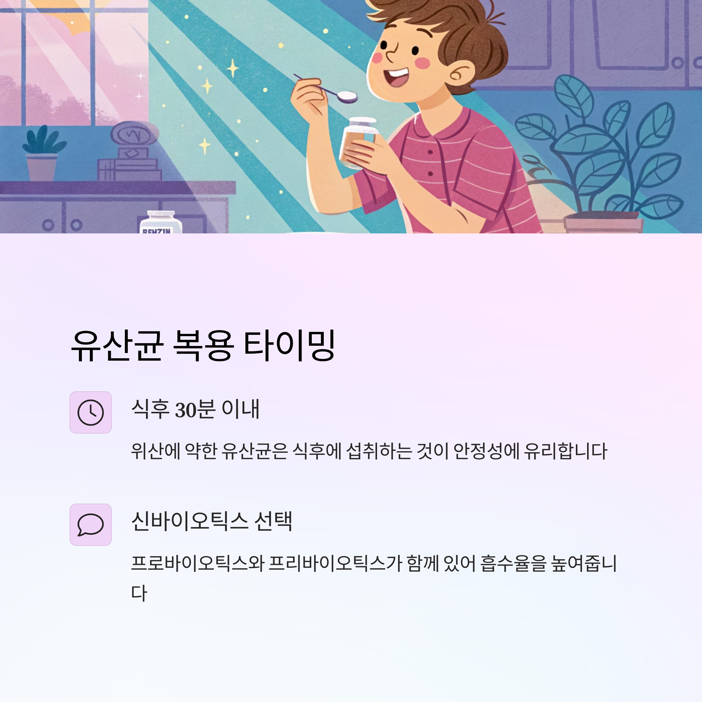 유산균은 위산에 약하기 때문에 섭취 타이밍이 중요합니다