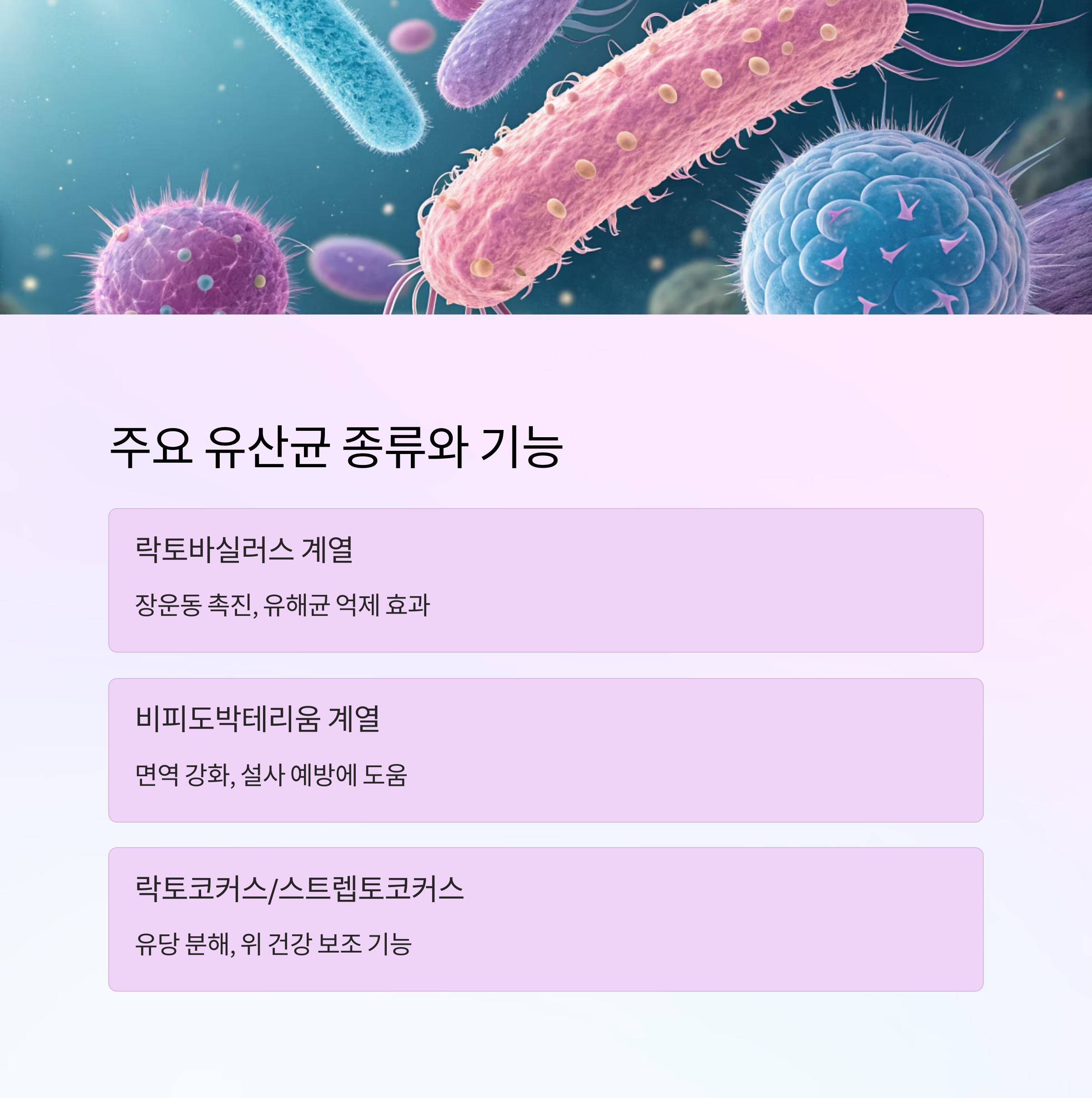 | 락토바실러스 계열 | 장운동 촉진, 유해균 억제 |