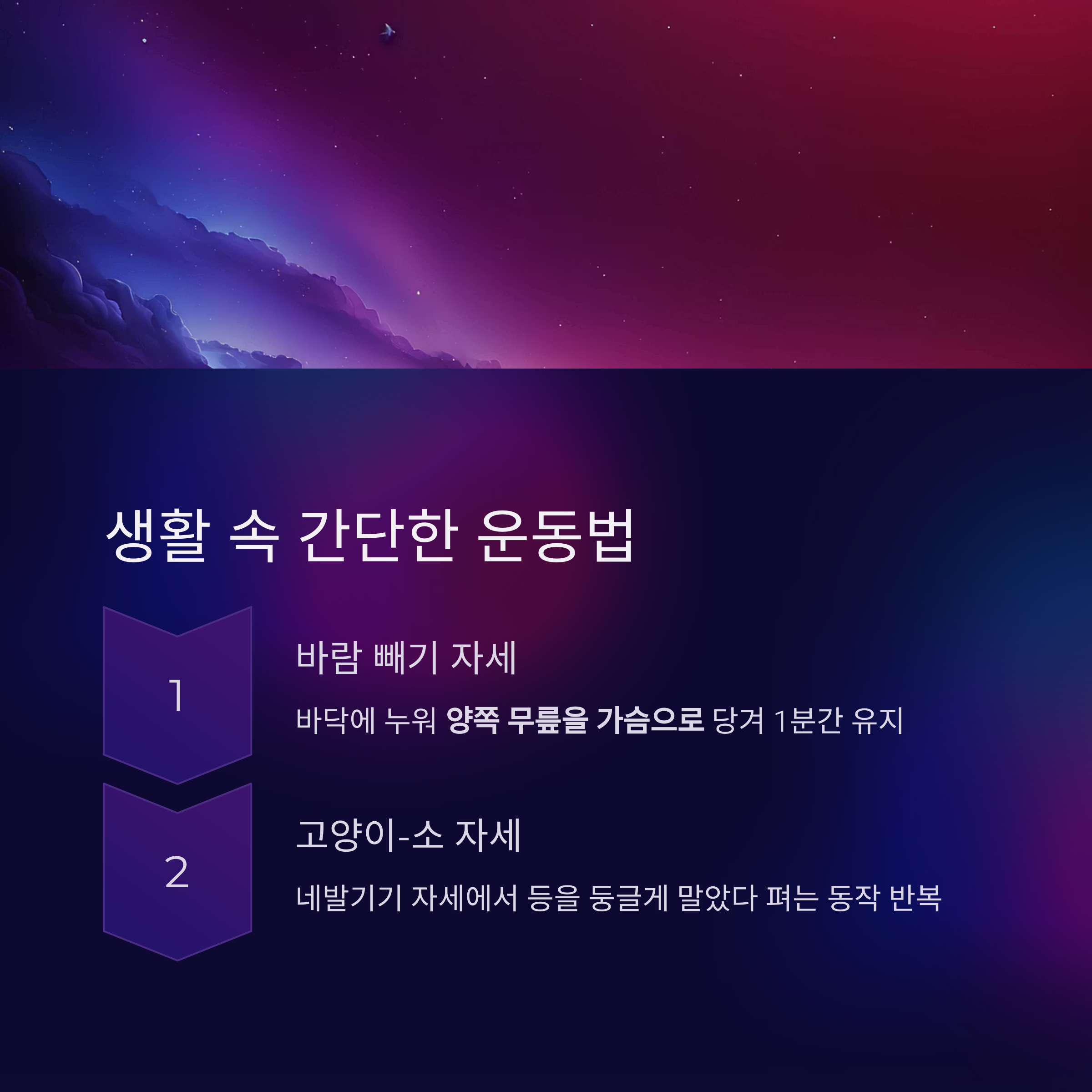 바닥에 누워서 무릎을 가슴 쪽으로 당겨 안는 자세를 30초간 유지해보세요. 이 자세는 복부 압력을 조절해 가스 배출을 도와줍니다.
