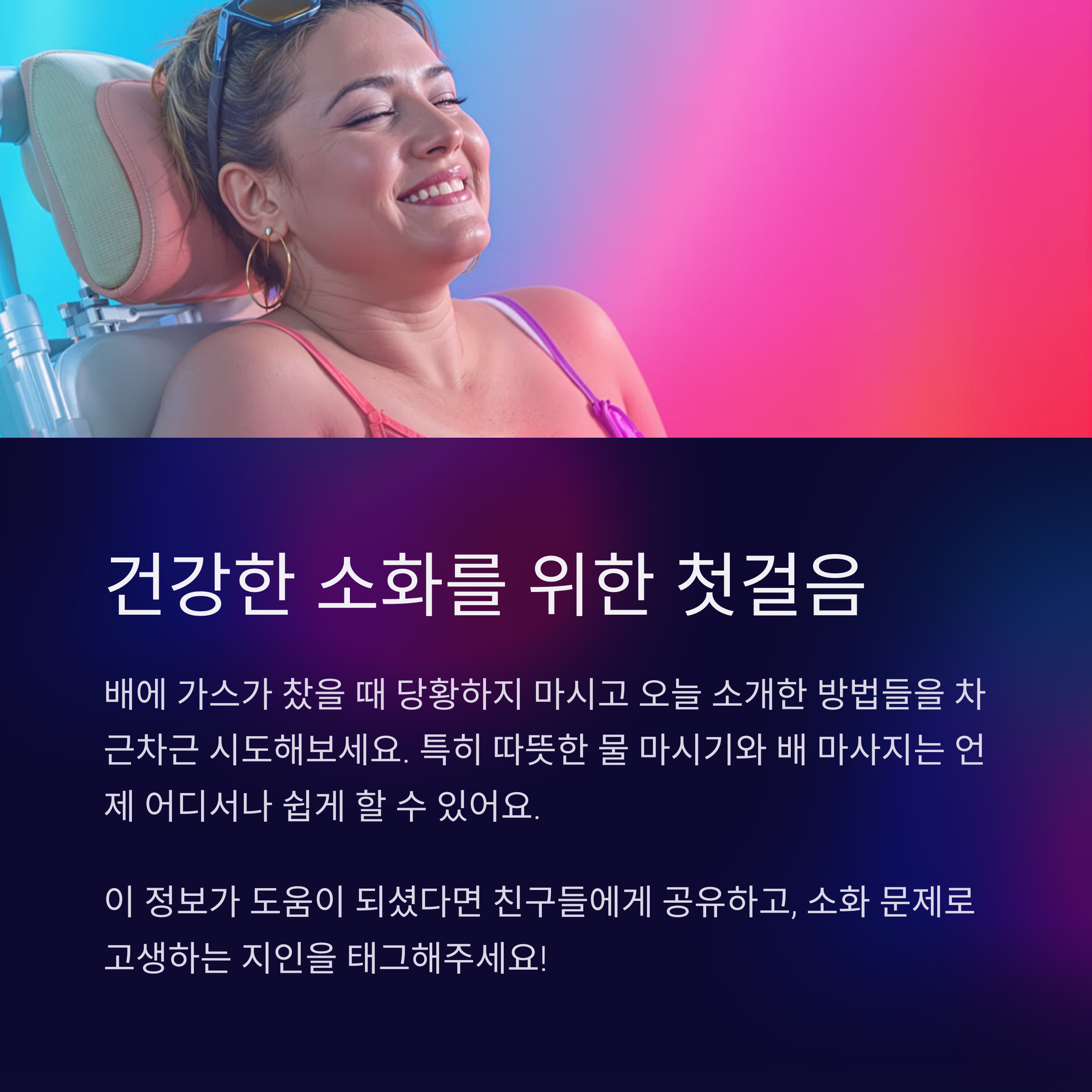 배에 가스가 찼을 때 당황하지 마시고 오늘 소개한 방법들을 차근차근 시도해보세요. 특히 따뜻한 물 마시기와 배 마사지는 언제 어디서나 쉽게 할 수 있는 방법이니 기억해두시면 도움이 될 거예요. 건강한 소화를 위해서는 평소 올바른 식습관을 유지하는 것이 가장 중요하다는 점, 잊지 마시길 바랍니다!