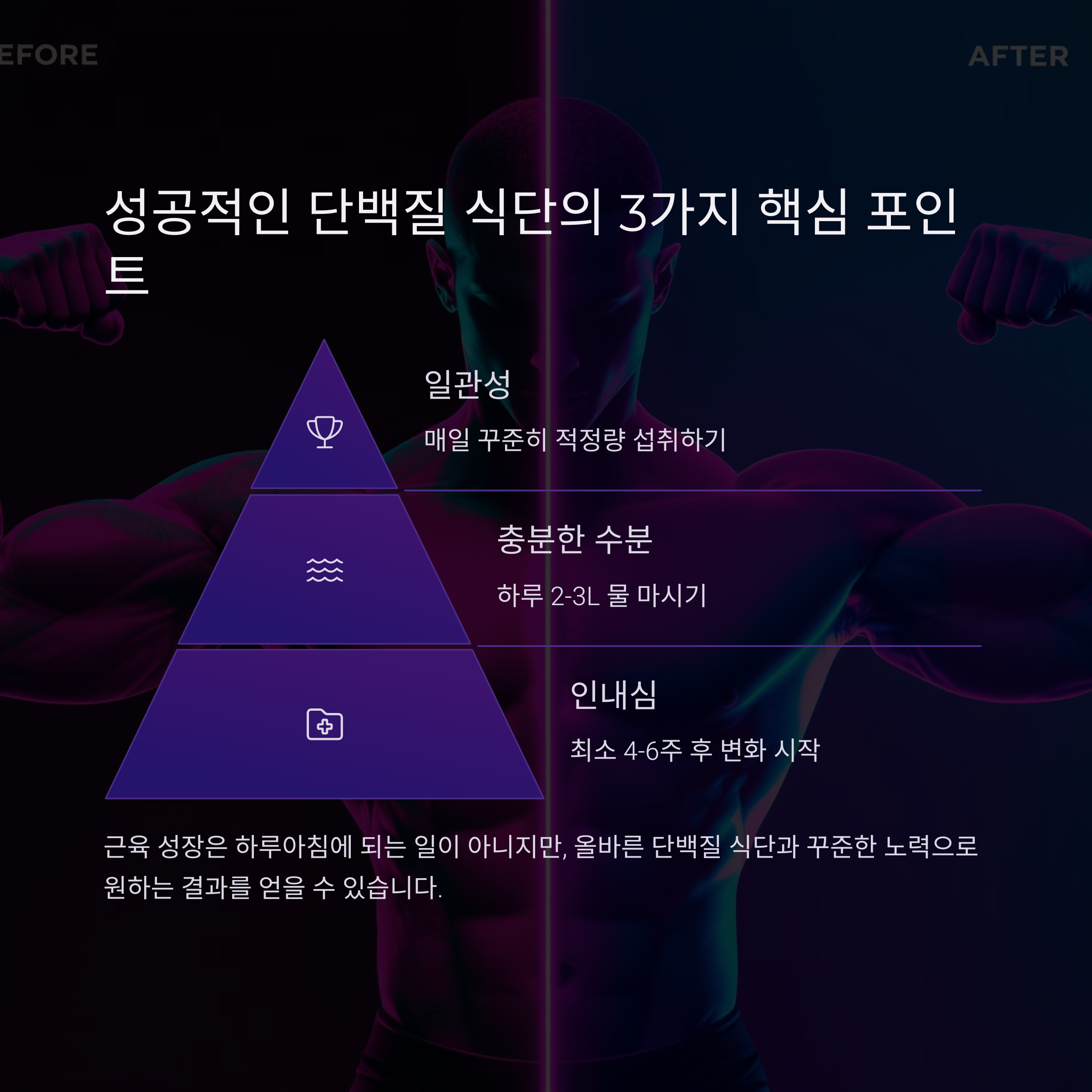 3. 인내심을 가지세요 근육 성장은 최소 4-6주 후부터 눈에 보이기 시작해요. 꾸준함이 가장 큰 비결이에요.