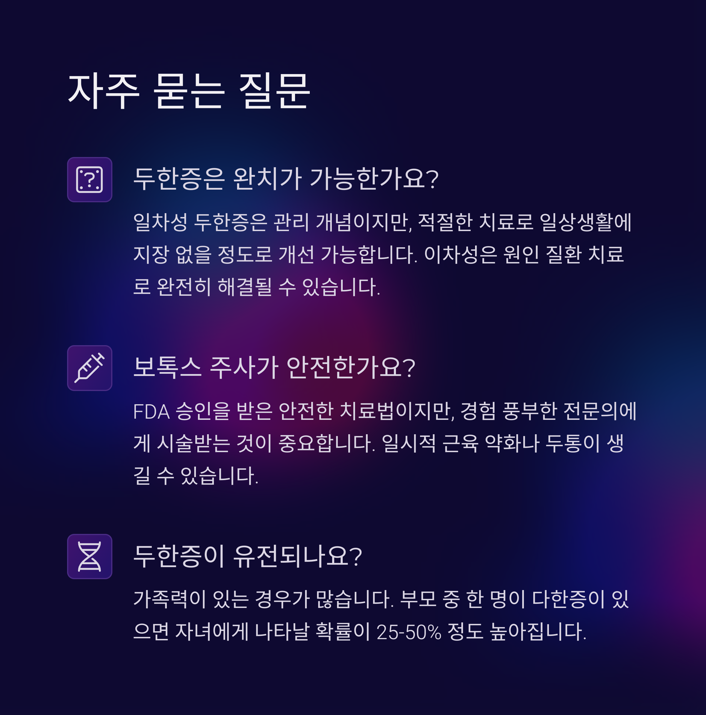 Q: 보톡스 주사가 안전한가요? A: FDA 승인을 받은 안전한 치료법이에요. 다만 경험이 풍부한 전문의에게 시술받는 것이 중요하고, 일시적인 근육 약화나 두통이 생길 수 있어요.