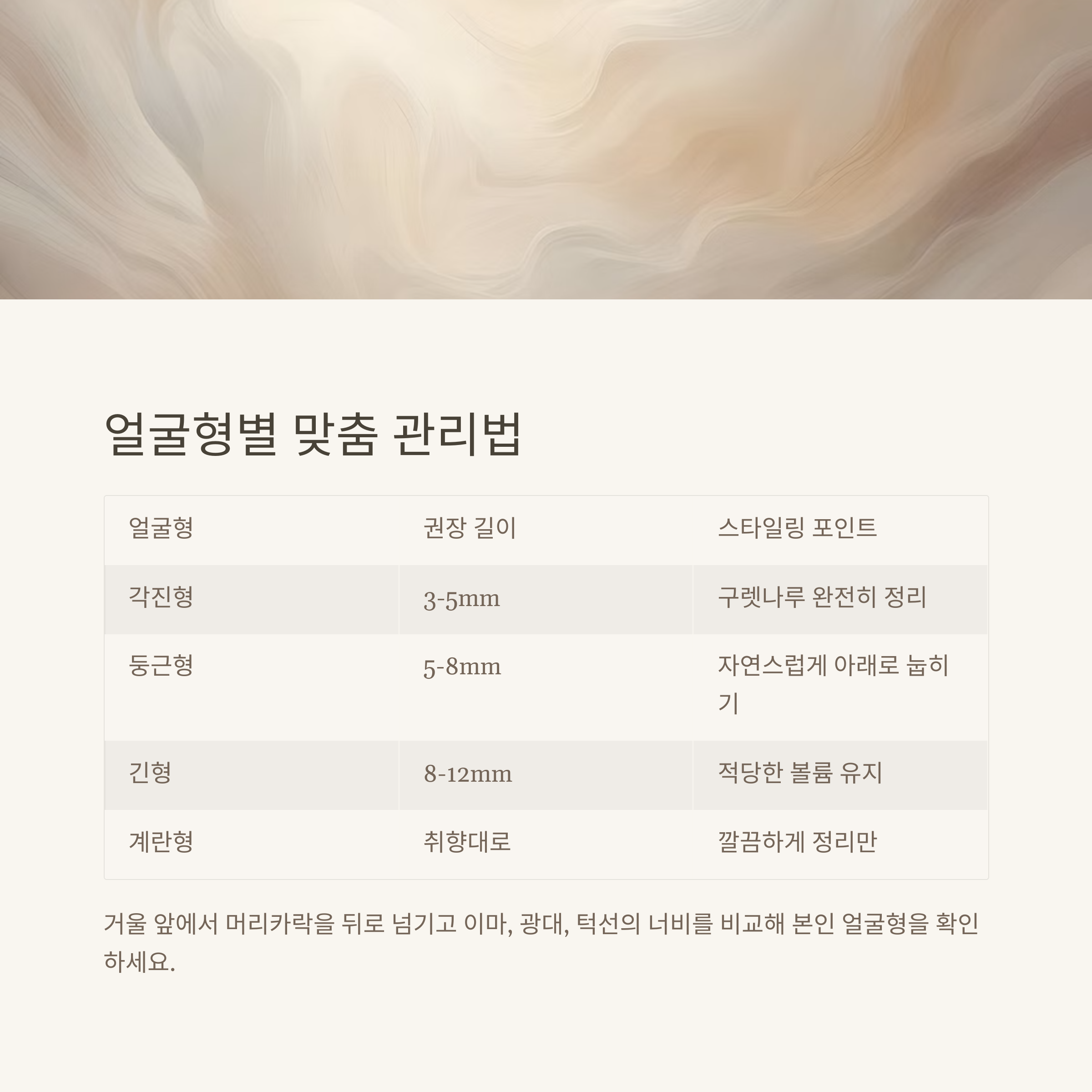 | 긴형 | 옆머리로 폭감 살리기 | 약간 길게(8-12mm) | 적당한 볼륨 유지 |