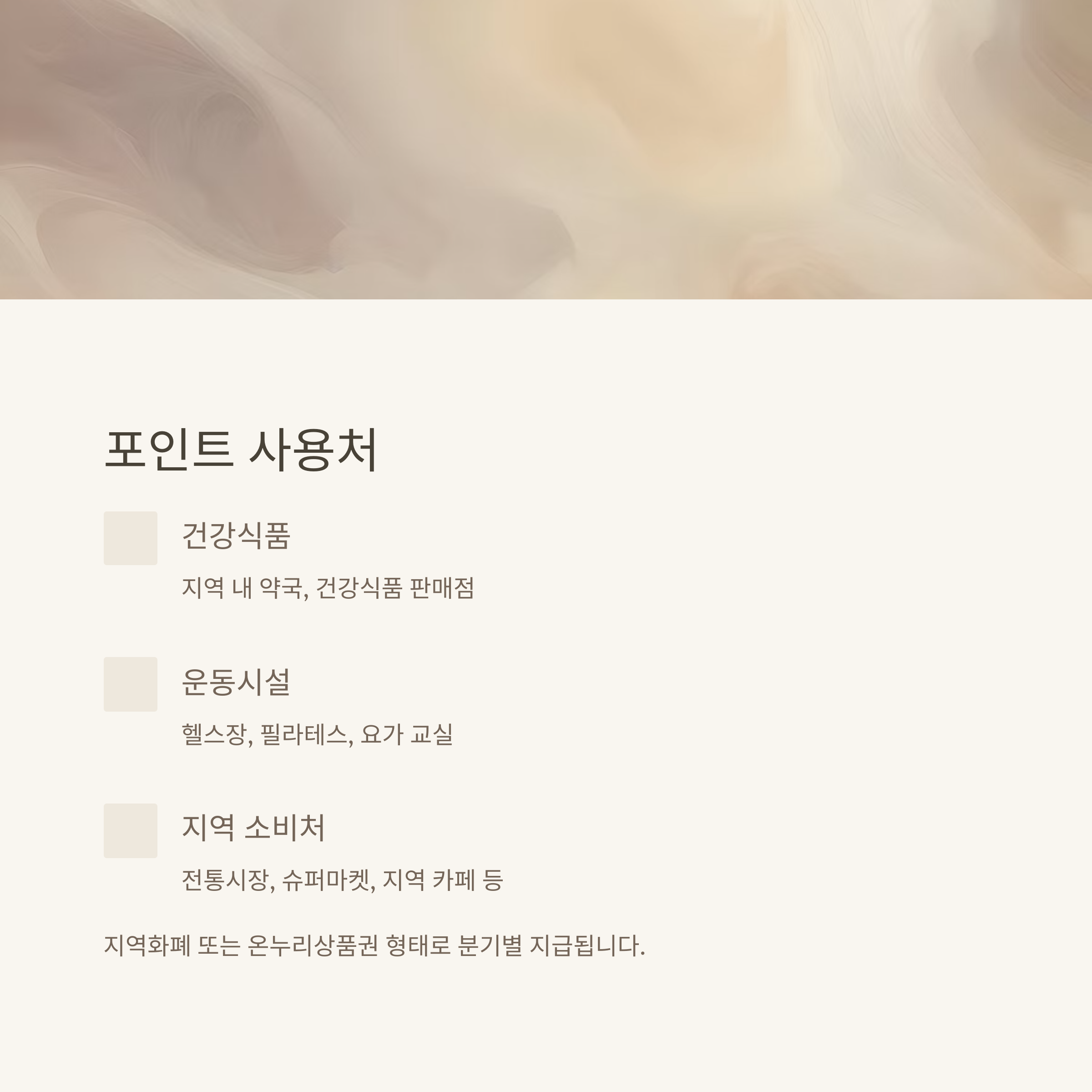 지역마트, 헬스장, 전통시장 등 건강 관련 소비처에서 사용 가능합니다.