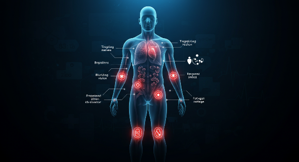 ✅ 주요 증상 → 비정상적인 피로감, 갈증 증가, 잦은 배뇨, 상처 치유 지연, 피부 변화 등이 나타날 수 있습니다.