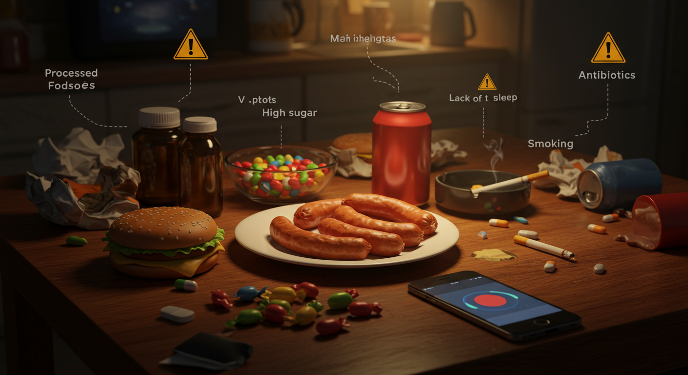 💡 핵심 요약: 과도한 설탕, 인공감미료, 과도한 알코올과 항생제 남용은 장내미생물 균형을 무너뜨리는 주요 원인입니다.