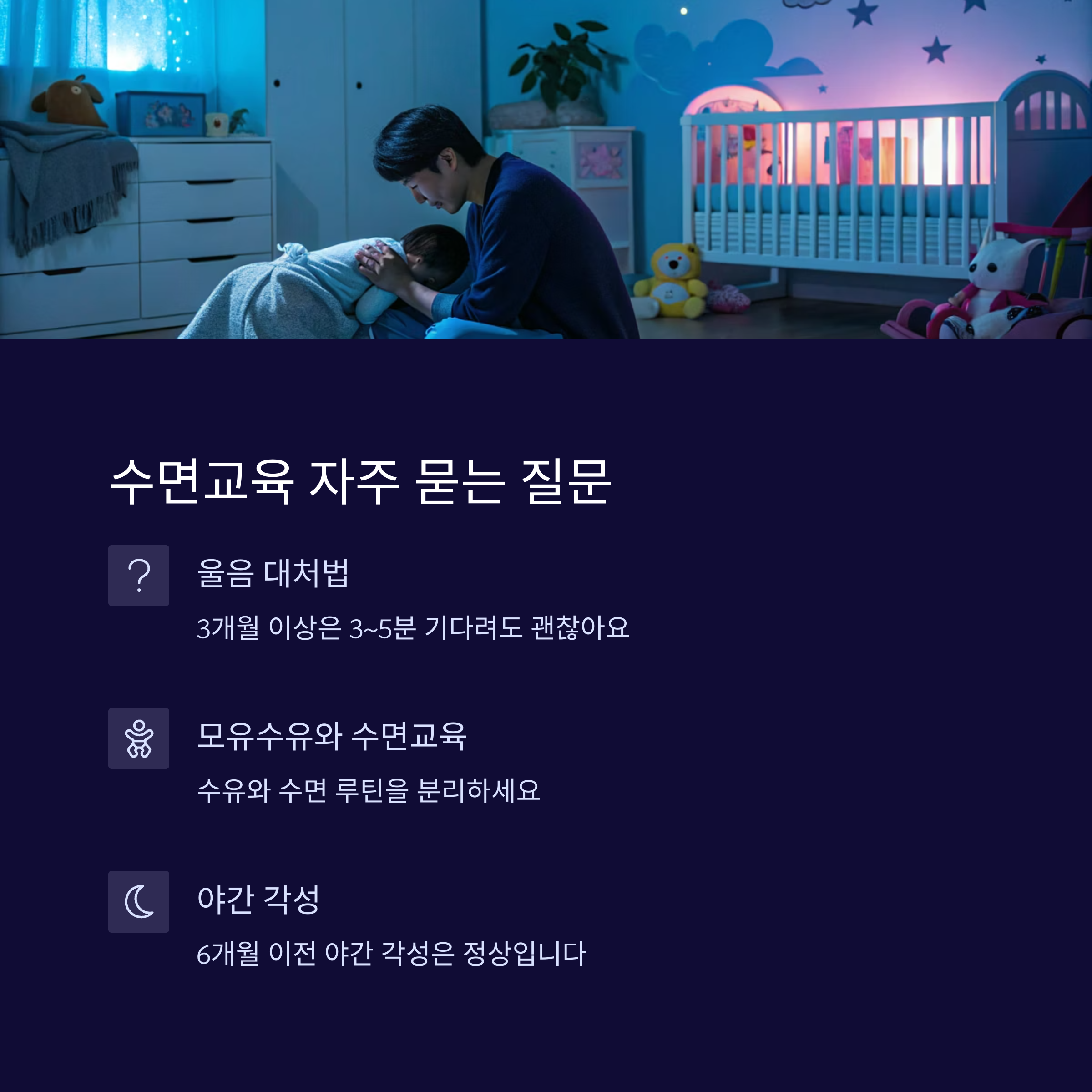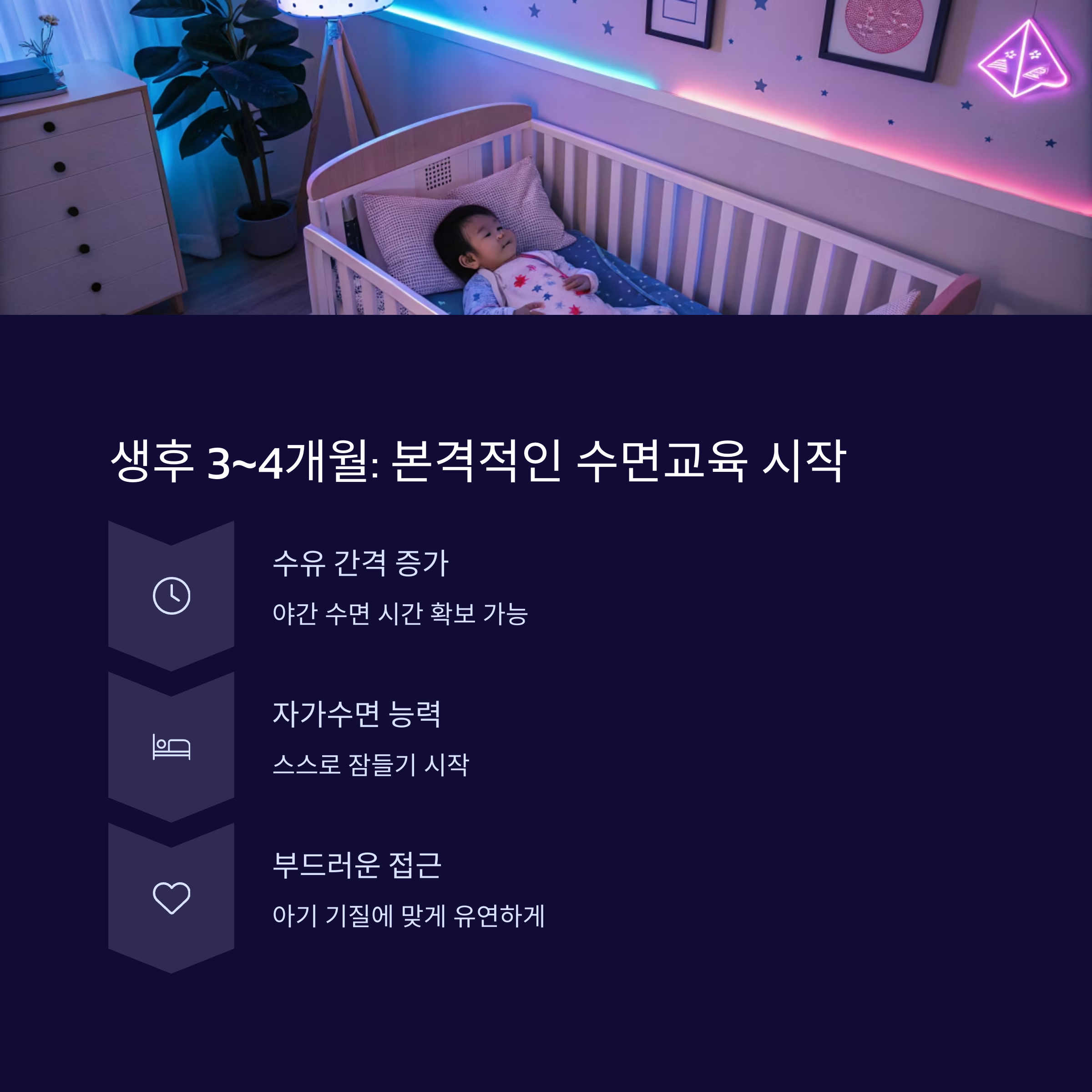 | 자가수면 연습 | 생후 3~4개월 이후 | 수면독립의 기초 |