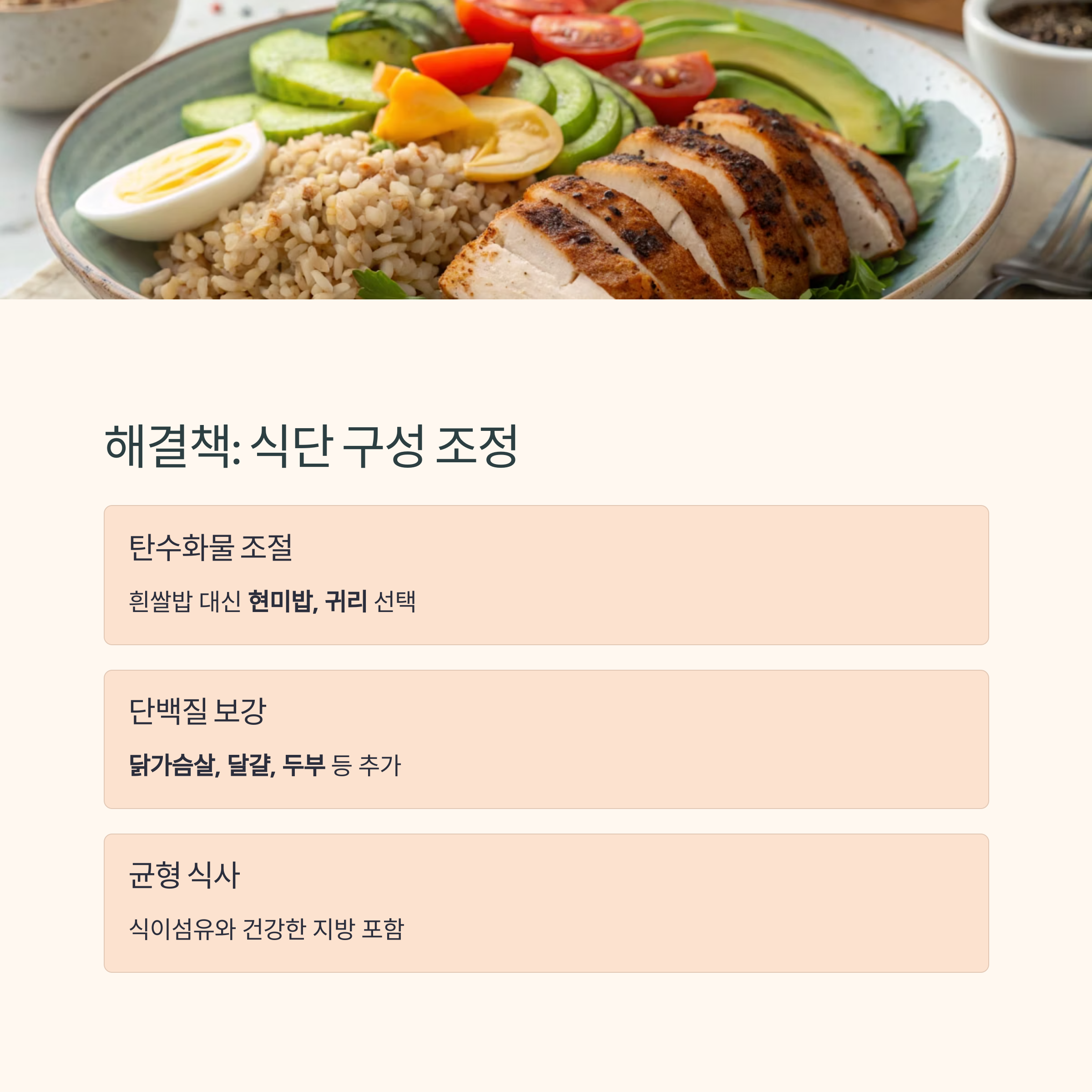 | 고탄수화물 섭취 | 식단에 단백질·섬유질 보강 |