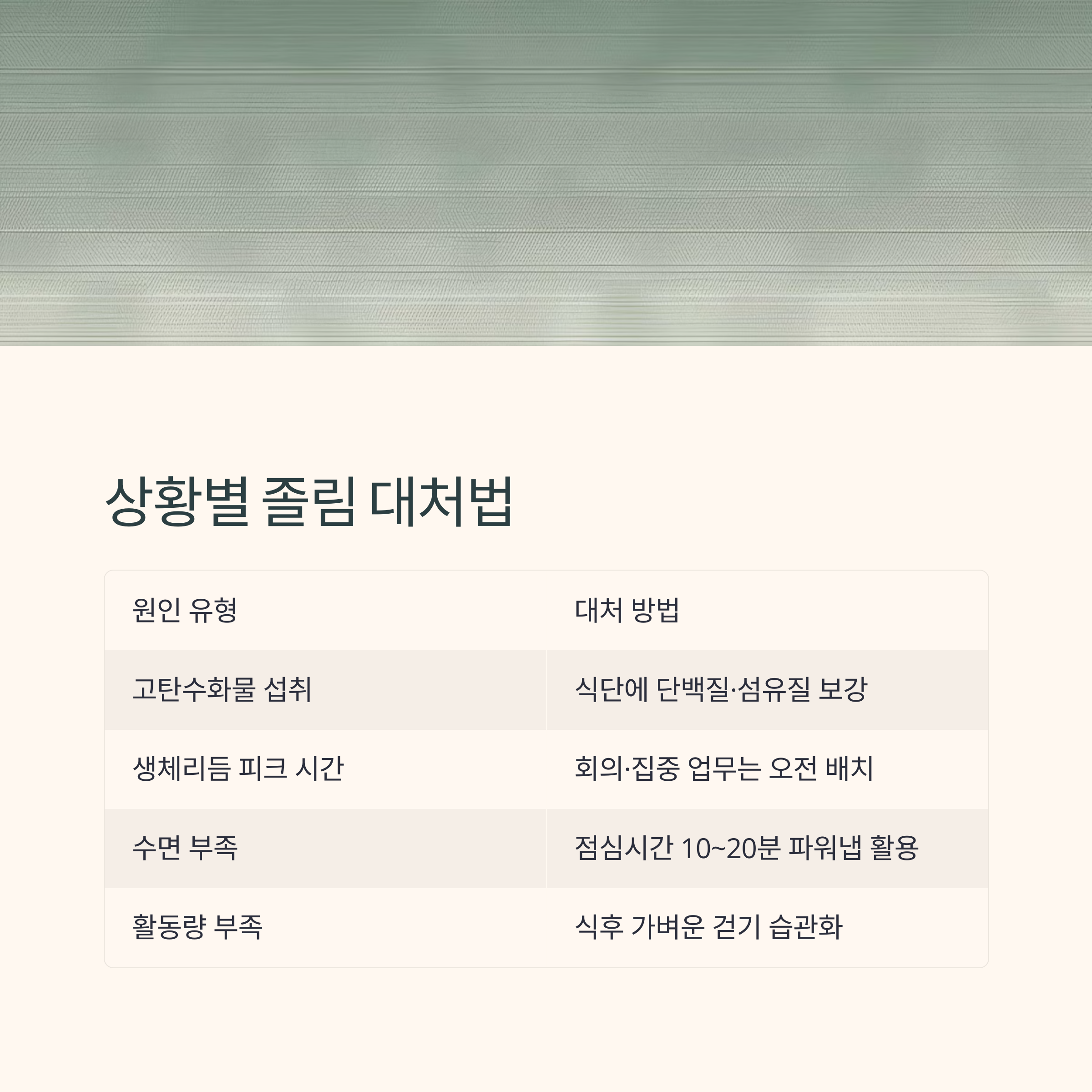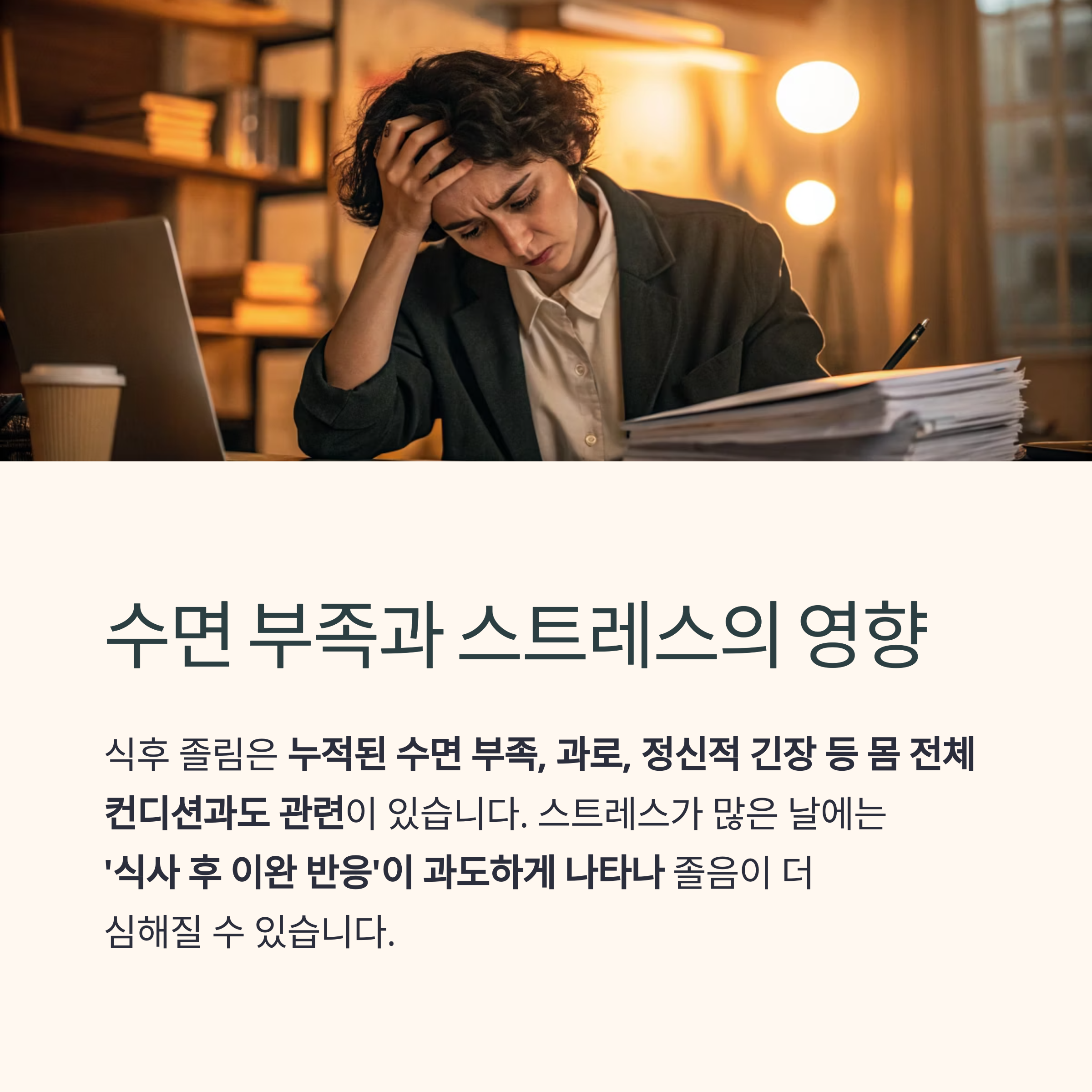 식후 졸림은 단순한 식사의 문제가 아닌 누적된 수면 부족, 과로, 정신적 긴장 등 몸 전체 컨디션과도 관련이 있습니다.