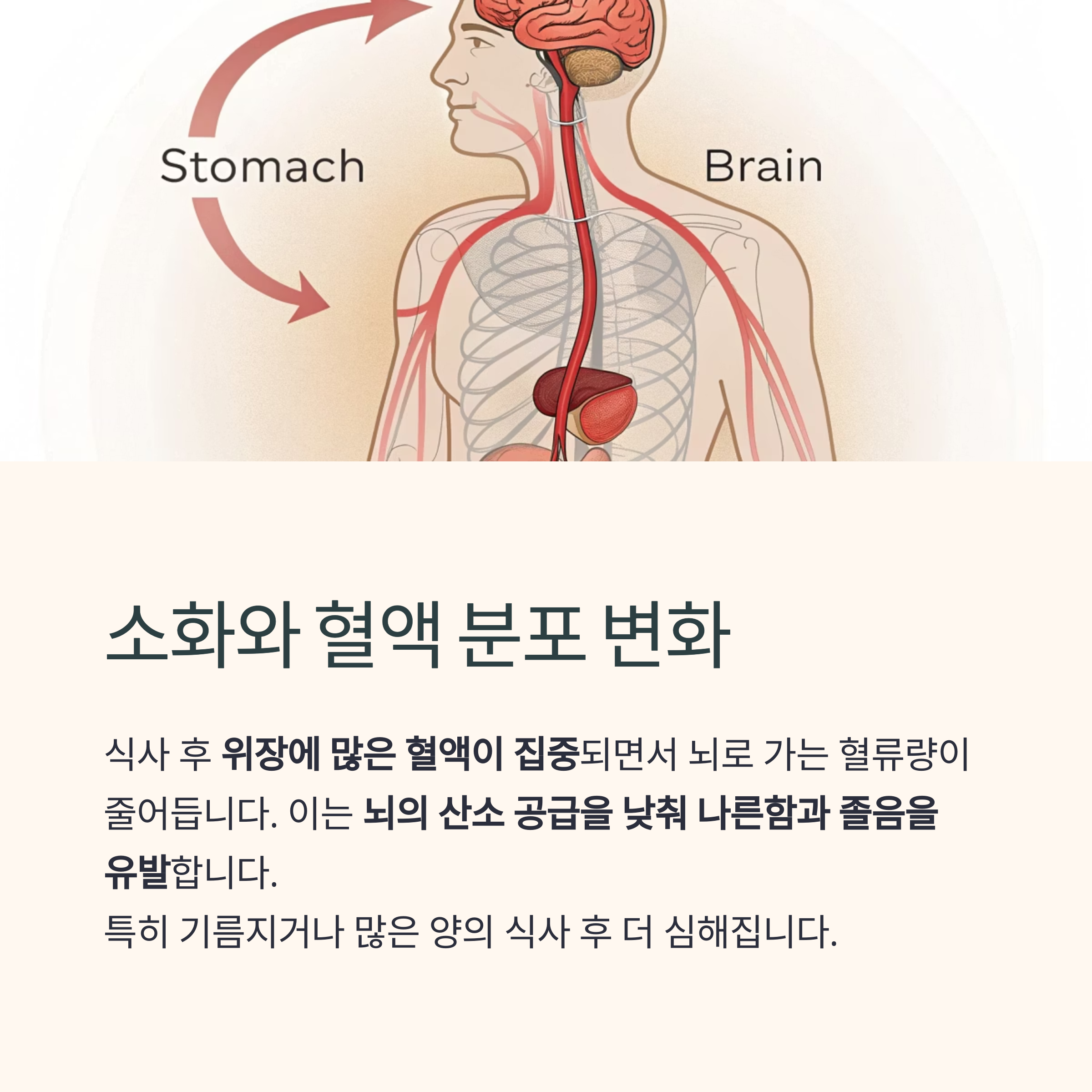 이는 뇌의 산소 공급을 일시적으로 낮춰 나른함과 졸음을 유발할 수 있습니다.