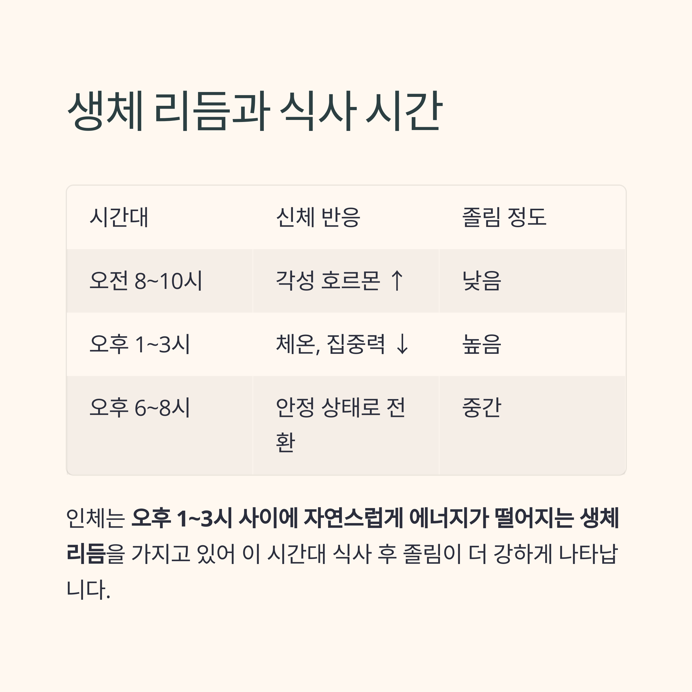 특히 기름지거나 양이 많은 식사를 한 후 졸림이 심해지는 경우가 많습니다.