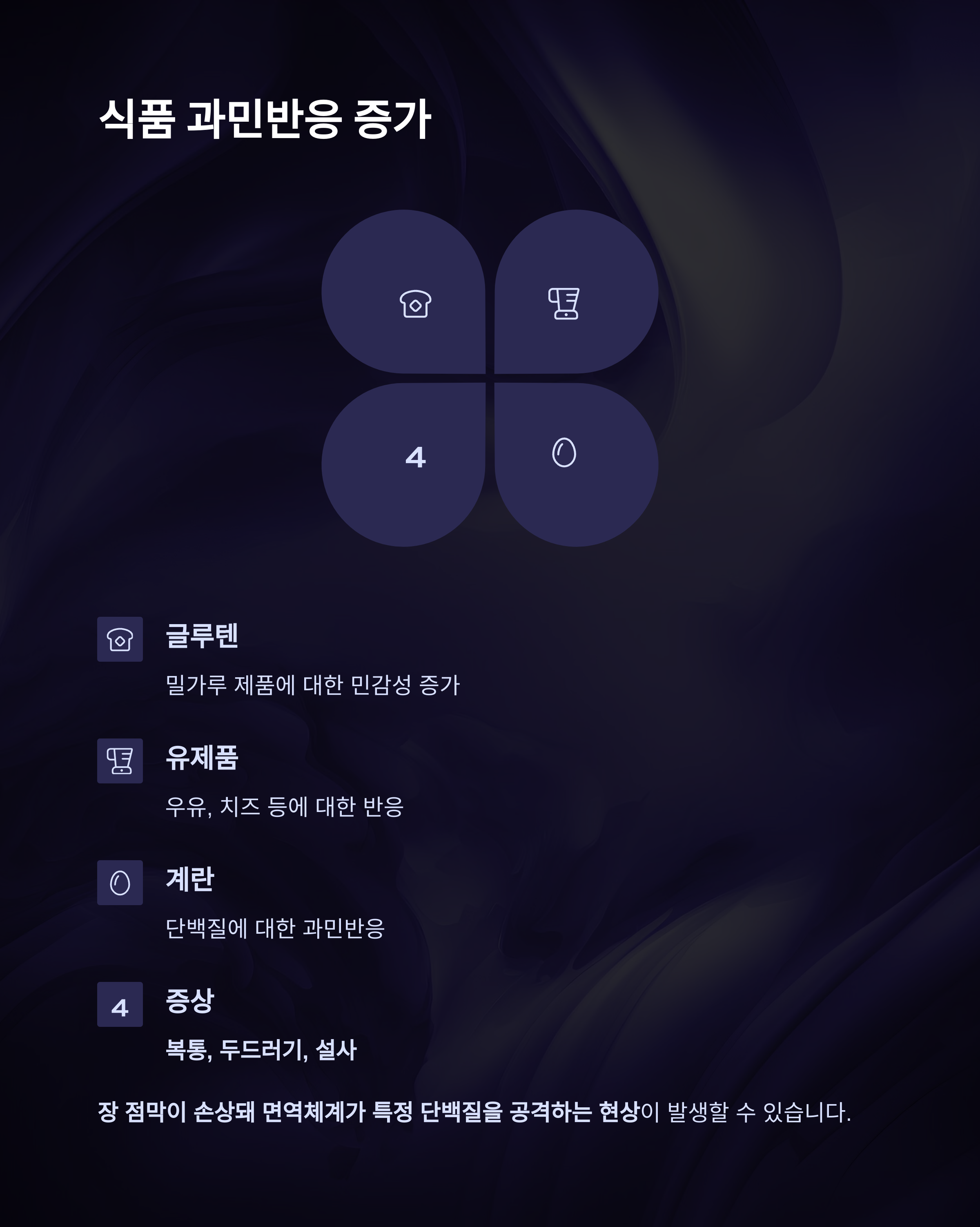특히 글루텐, 유제품, 계란 등 단백질 식품에 반응이 많아지는 것이 특징입니다.