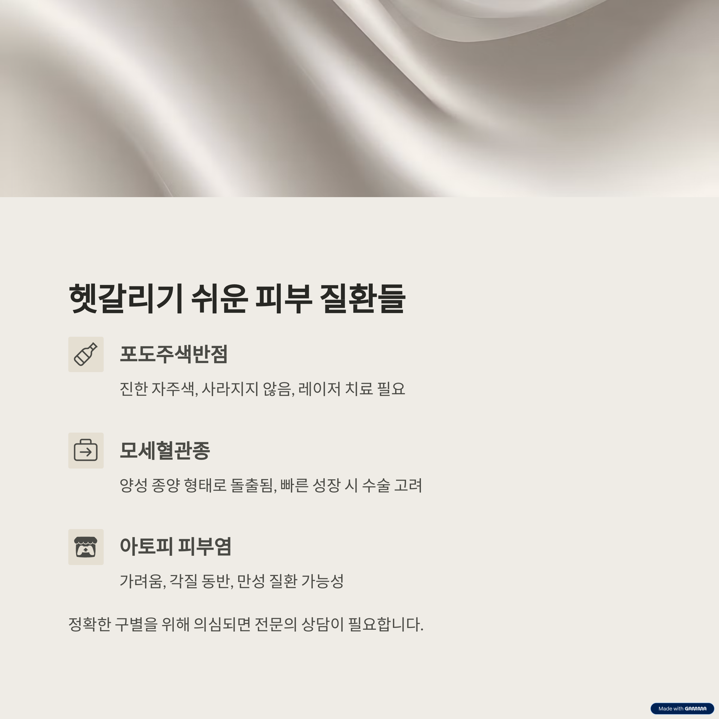 | 포도주색반점 | 진한 자주색, 사라지지 않음 | 레이저 치료 필요 |