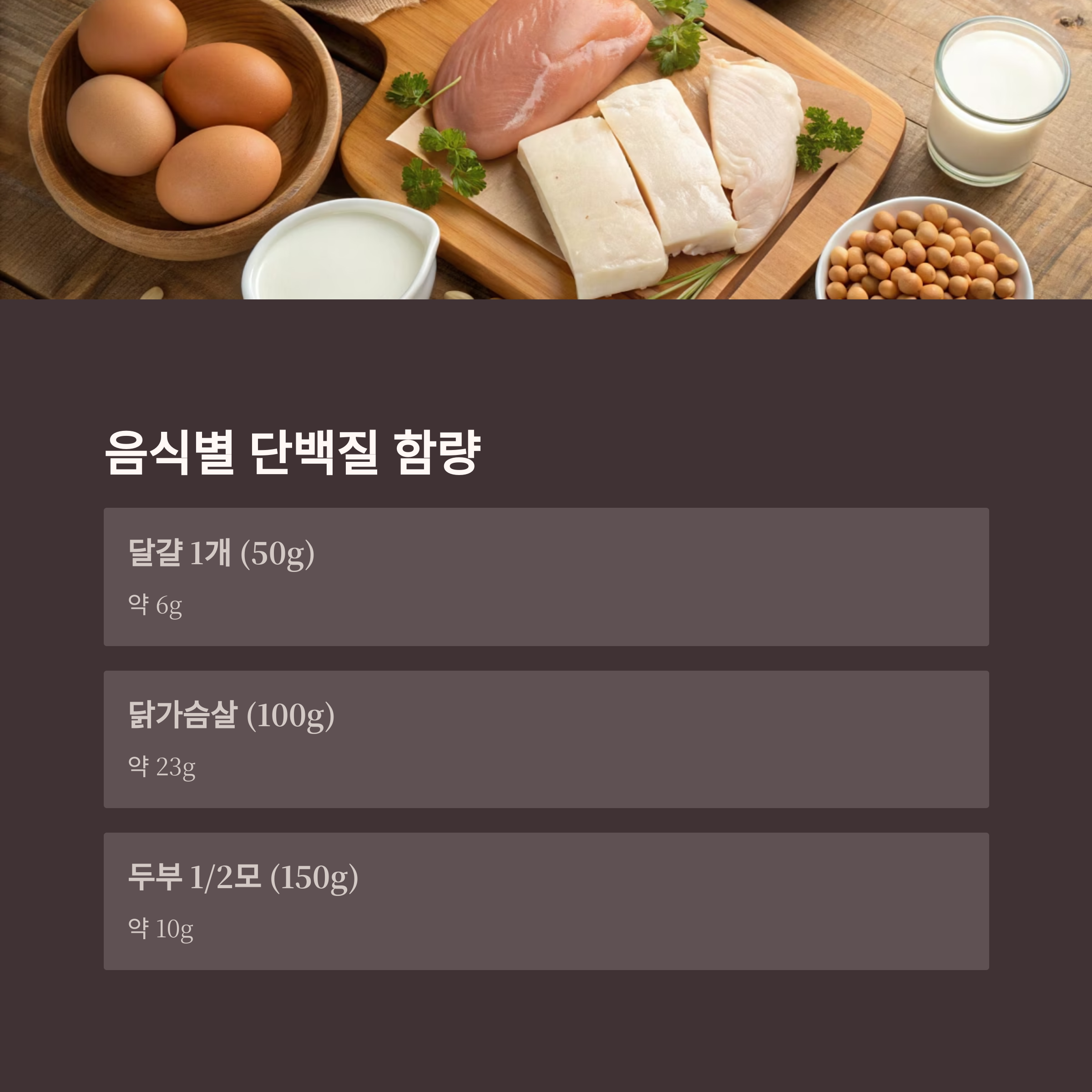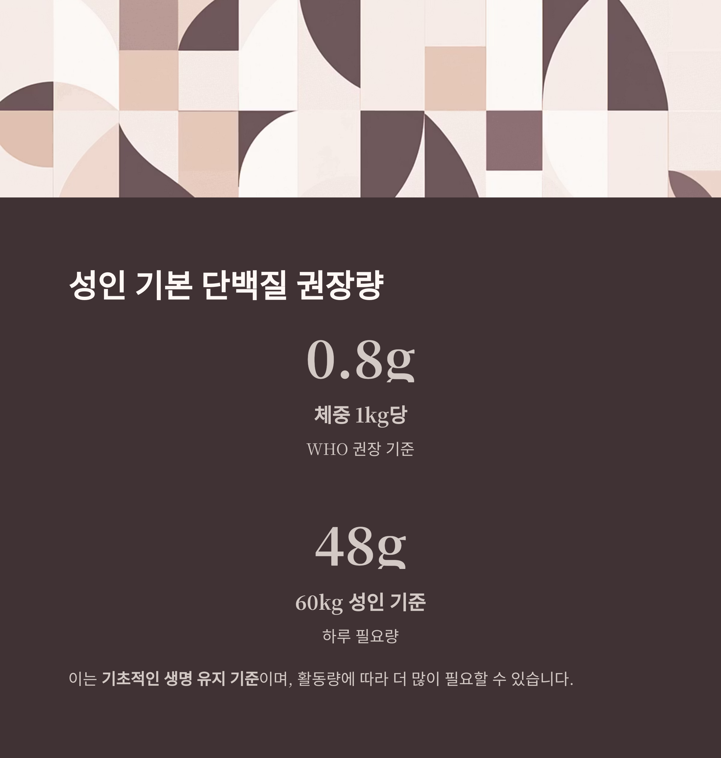 즉, 체중 60kg의 성인이라면 하루 약 48g의 단백질이 필요합니다.