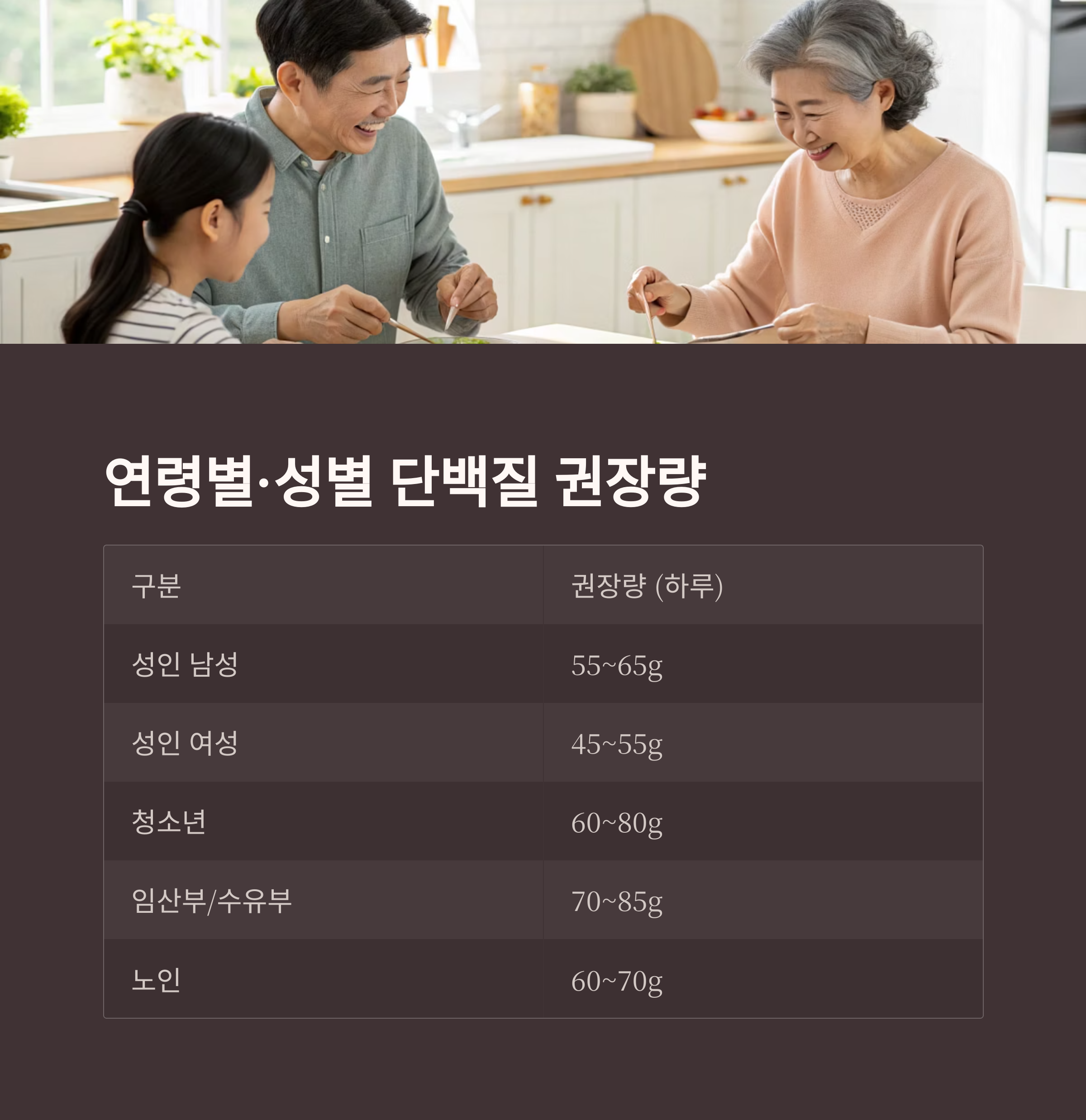| 노인 | 60~70g | 근감소증 예방을 위해 증가 |