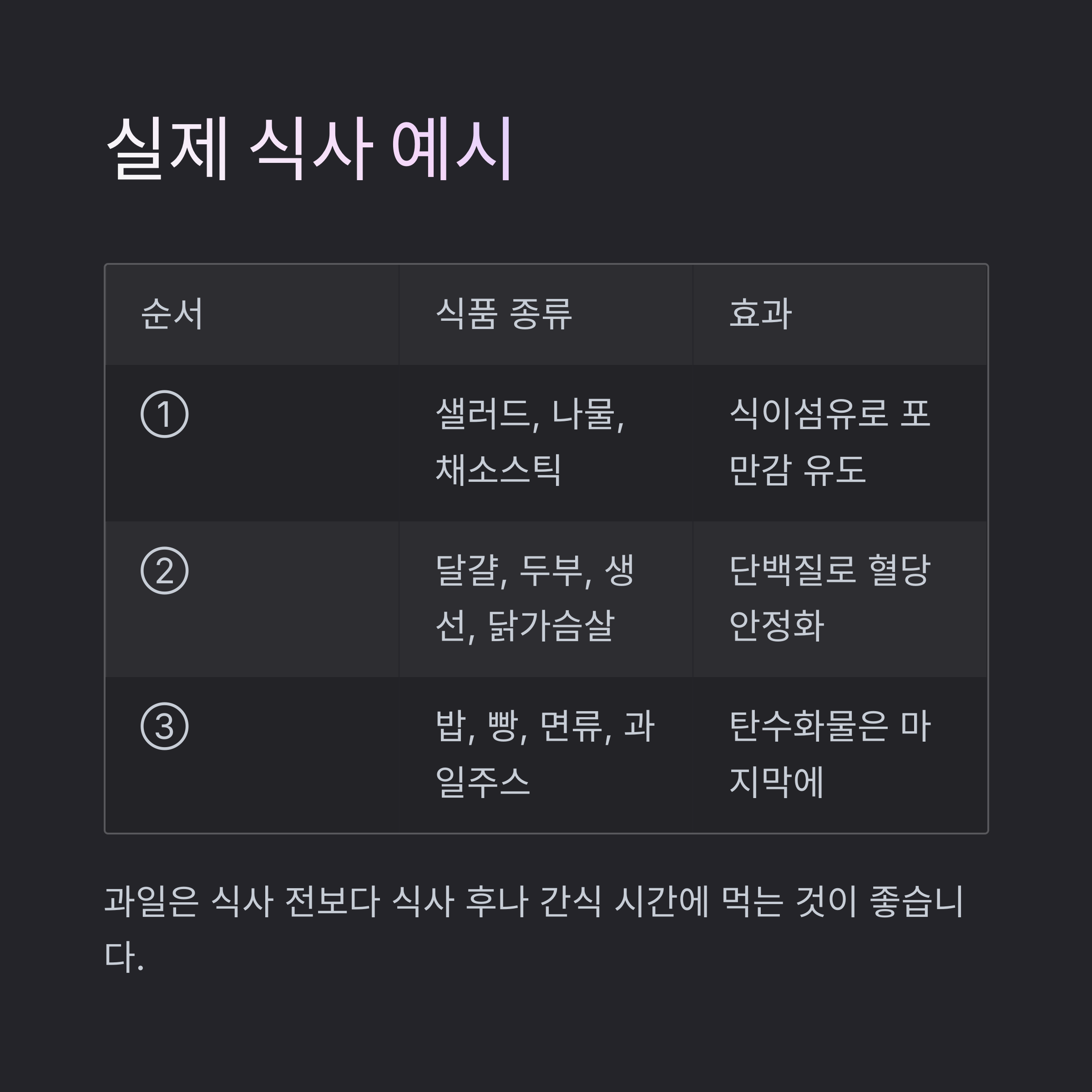 | ③ | 밥, 빵, 면류, 과일주스 | 탄수화물은 천천히 마무리 |