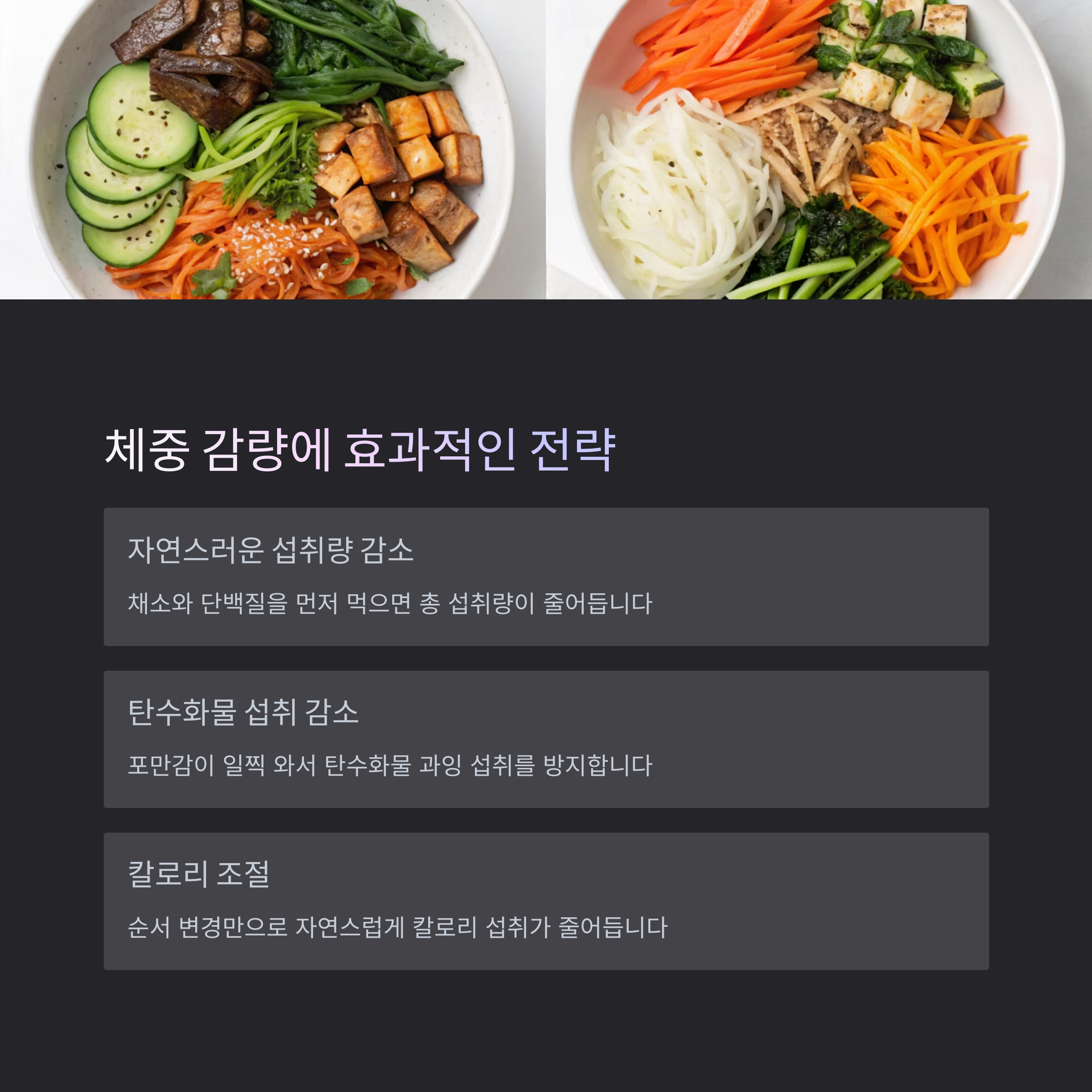 | ① | 샐러드, 나물, 채소스틱 | 식이섬유로 포만감 유도 |