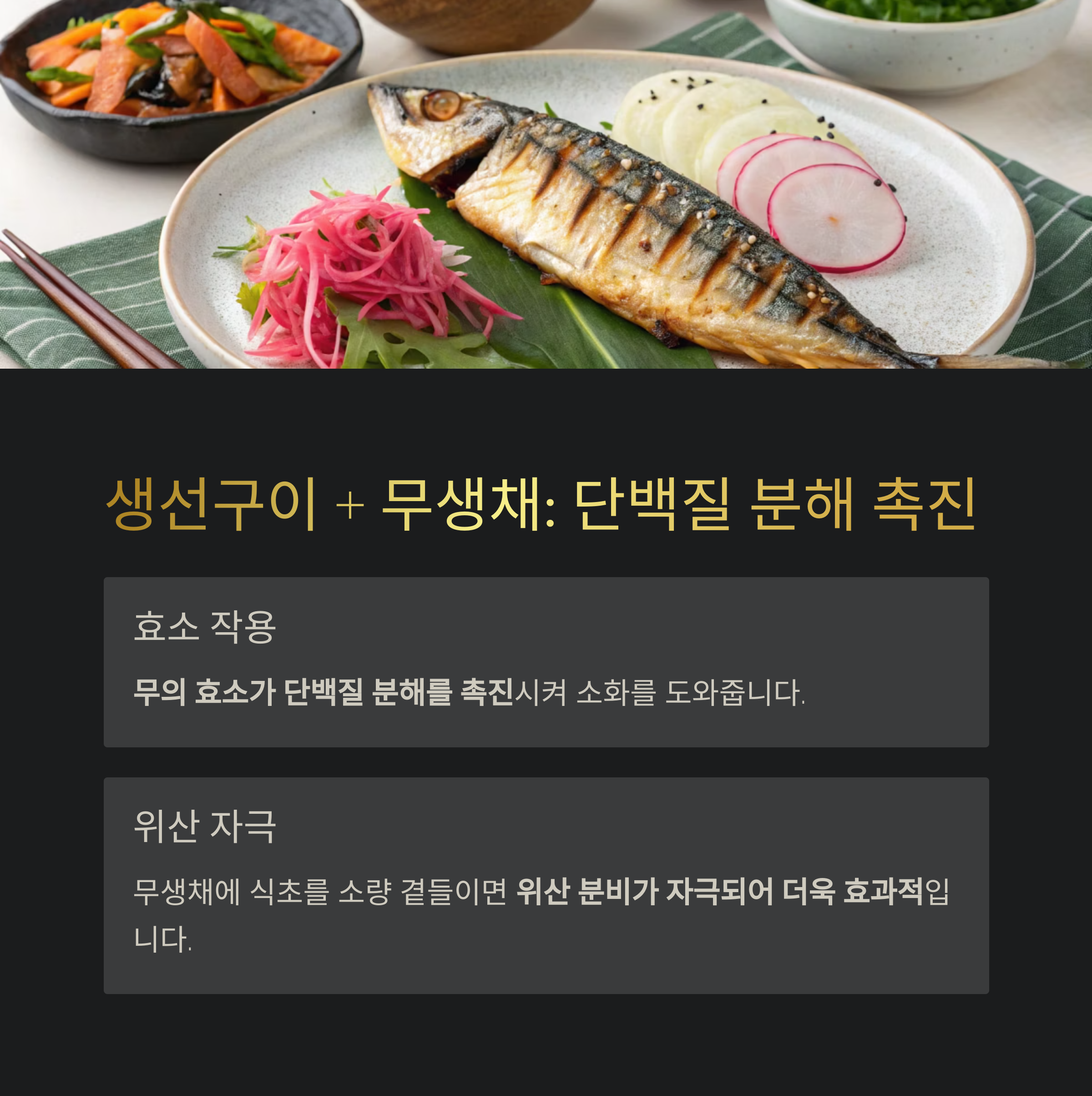 생선구이 + 무생채: 단백질 분해를 돕는 산성 조합