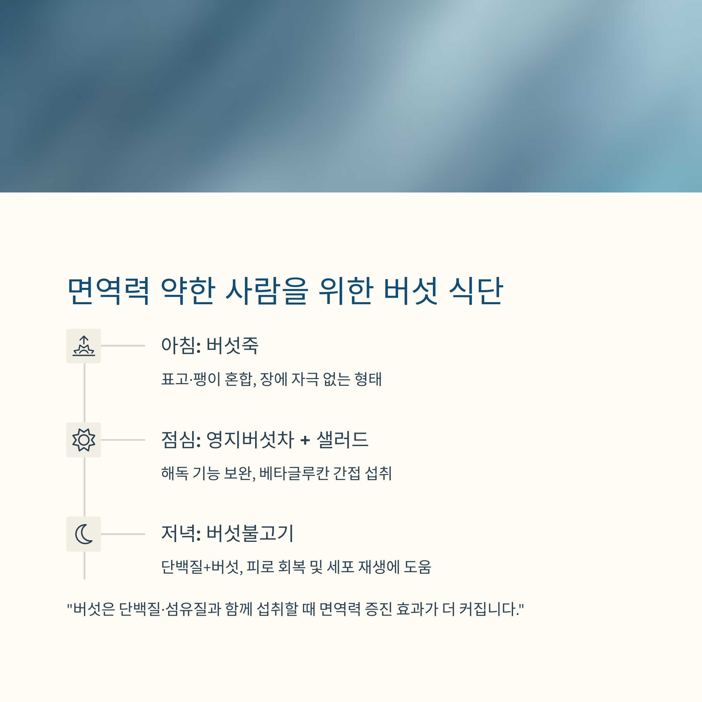 “버섯은 단독보다 단백질·섬유질과 함께 섭취할 때 면역력 증진 효과가 더 커집니다.”