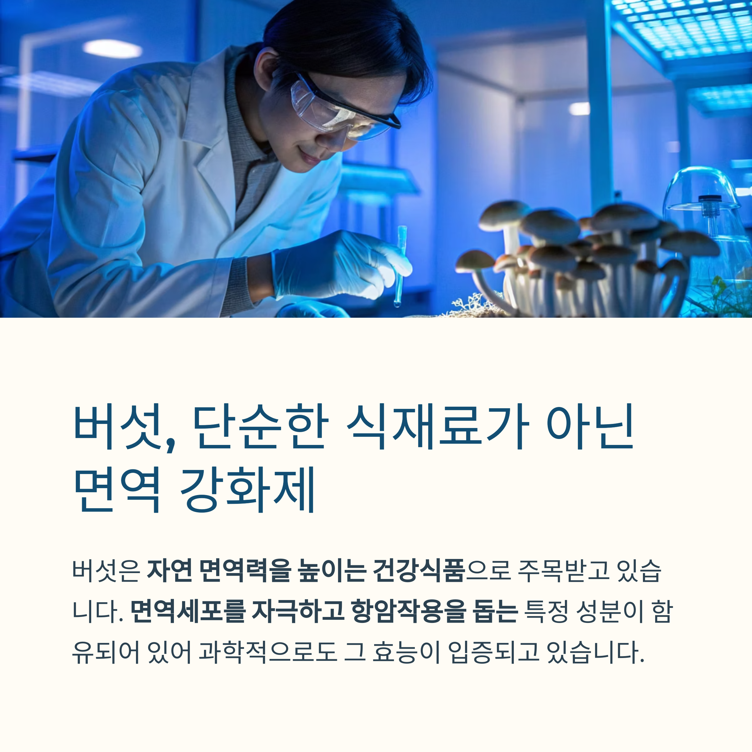 “버섯은 ‘먹는 면역 강화제’로 불릴 만큼 항바이러스·항염 효과가 주목받고 있습니다.”