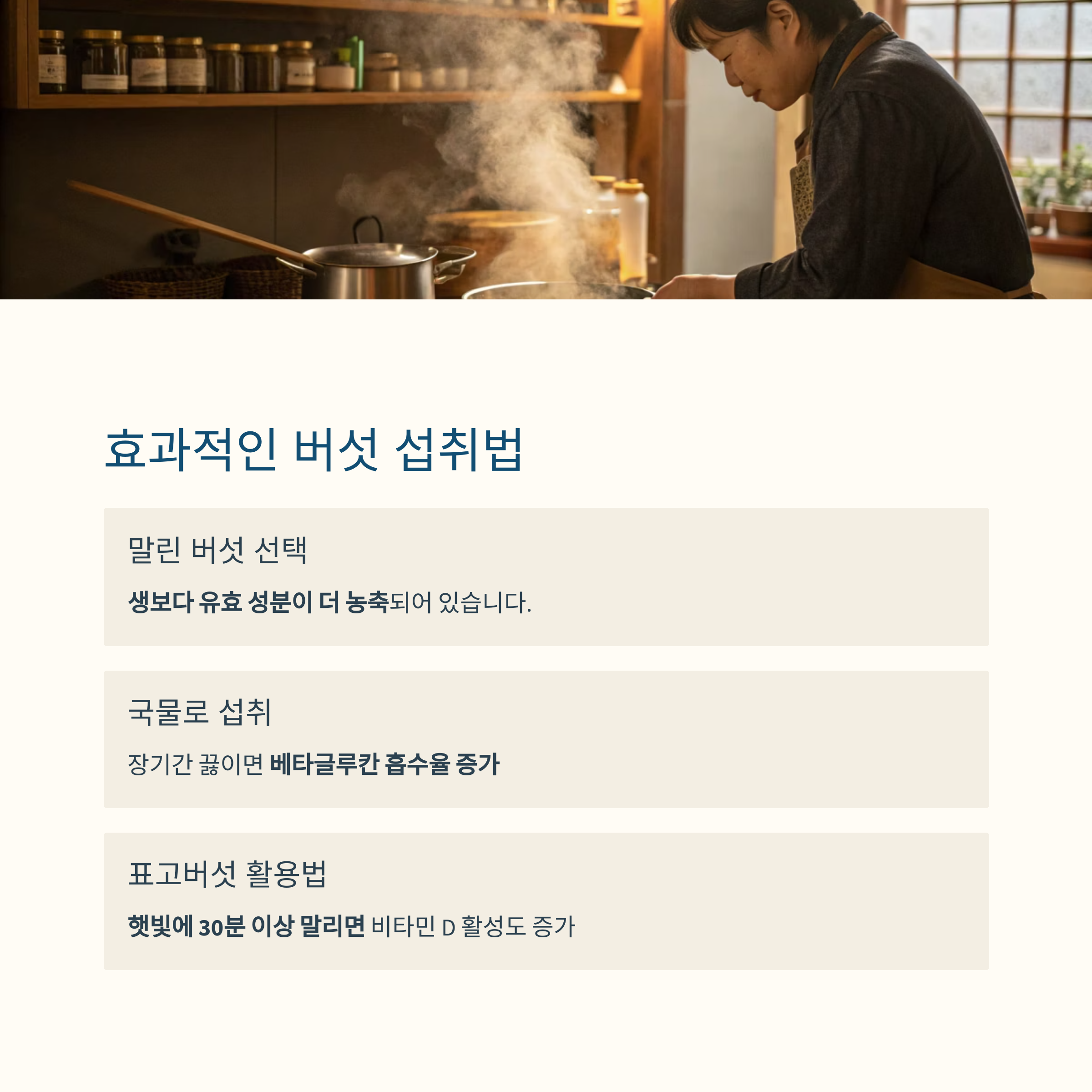 | 표고버섯 | 베타글루칸 함량 높음, 항암 연구 활발 | 말려서 끓이거나 구이 |